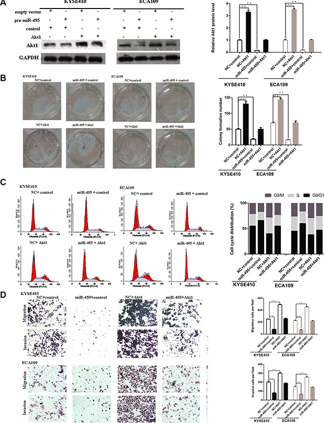 Figure 5: Akt1 are involved in the role of miR-495 in regulation of ESCC cell activity. (A) Representative images of western blot analysis of the Akt1 protein level in ESCC cells after transfection. The expression level of Akt1 protein in cells transfected with plasmid were higher than that of the negative control, even with suppression by miR-495. (B) Representative images (left) and quantifiation (right) of ESCC cell colonies, as determined by colony formation assay after transfection. The suppressive effects of miR-495 on cell proliferation has been partially attenuated by the expression of Akt1. (C) Flow cytometry analysis of ESCC cells after transfection. The effects of miR-495 on cell cycle has been partially abolished by the expression of Akt1. (D) Representative images (left) and quantifiation (right) of migratory and invasive cells per field after transfection. The effects of miR-495 on cell migration and invasion has been partially abolished by the expression of Akt1.