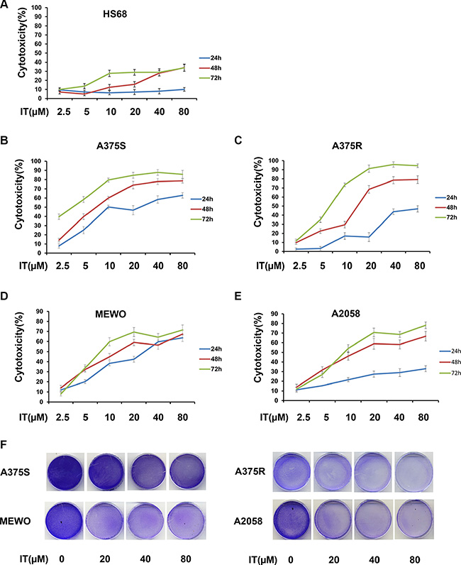 The cytotoxicity of IT was determined by MTT assay (Figure 1A–1E), and crystal violet staining (Figure 1F). IT treatment (2.5, 5, 10, 20, 40 and 80 μM; 24, 48, and 72 h) significantly induced cytotoxicity to human melanoma A375S (parental cells, sensitive to BRAF inhibitor), A375R (resistant to BRAF inhibitor), A2058, and MEWO cells in a time- and dose-dependent manner. The 50% inhibitory concentration (IC50) of IT for 72 h was 2.7, 6.9, 14, and 15.6 μM in A375S, A375R, A2058, and MEWO cells, respectively. IT treatment only showed minor cytotoxicity to human skin fibroblast cells (HS68).
