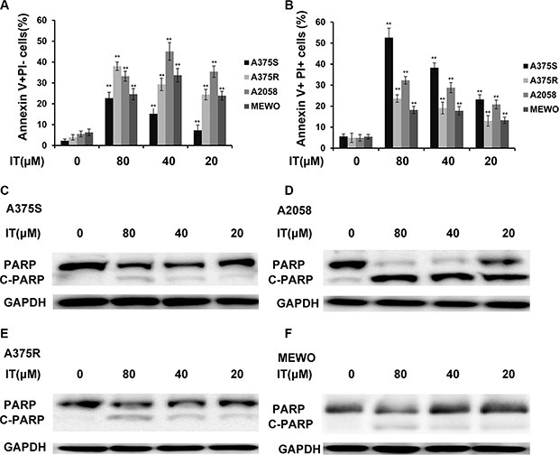 Figure 3: IT induced melanoma cells apoptosis with PARP cleavage. Percentages of annexin V+/PI− (A) and annexin V+/PI+ (B) cells were presented as the mean ± SD of three independent experiments. **indicate P < 0.01, as compared with vehicle control group. PARP cleavage in melanoma cells (C) A375S; (D) A2058; (E) A375R; (F) MEWO) after treated with various concentrations of IT (20, 40, and 80 μM) or vehicle control for 48 h were detected by western blot analysis.