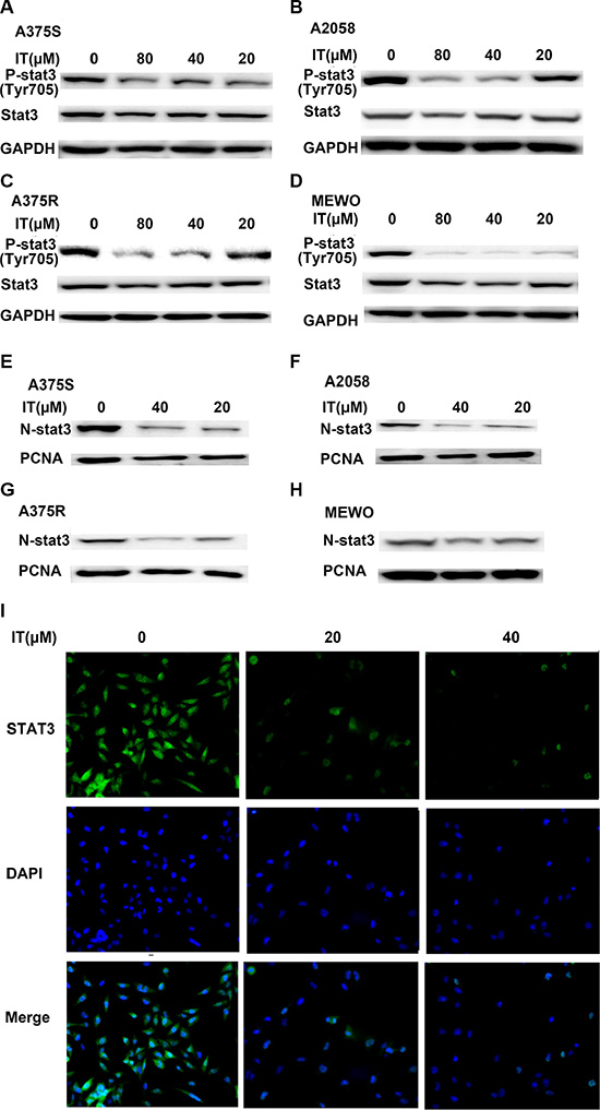 Figure 4: IT inhibited STAT3 activation and nuclear localization in melanoma cells. A375S, A2058, A375R, and MEWO cells were treated with various concentrations of IT (20, 40, and 80 μM) or vehicle control for 24 h, and then total cell lysates (A, B, C, and D) or nuclear lysates (E, F, G, and H) were extracted for western blot analysis by using antibodies specific to p- STAT3 (tyr705) or STAT3. GAPDH or PCNA was used as loading control for total protein or nuclear protein, respectively. For immunostaining analysis (I, ×100), A375 cells were treated with IT (0, 20, and 40 μM) for 6 h, the expression of STAT3 was analyzed using a specific mAb and an Alexa Fluor-488-conjugated secondary antibody. The nuclei were stained with DAPI.