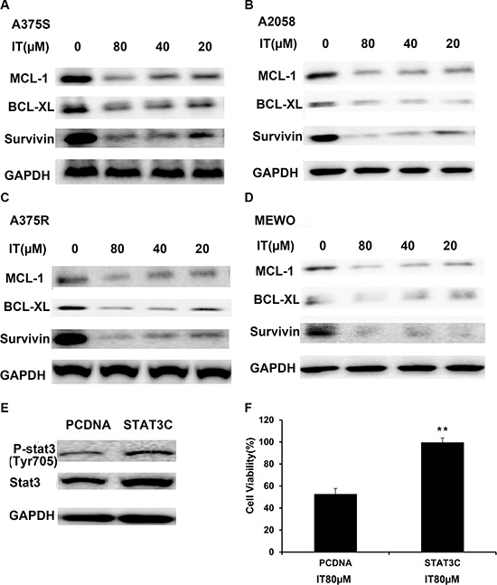 Figure 5: IT inhibited STAT3 target genes expression, while overexpression of STAT3 partially reversed IT-induced growth inhibition. A375S (A), A2058 (B) , A375R (C), and MEWO (D) cells were treated with various concentrations of IT ( 20, 40, and 80 μM) or vehicle control for 72 h, and then total cell lysates were extracted for western blot analysis using antibodies specific to MCL-1, BCL-XL, and survivin. A375S cells were transiently transfected with STAT3-C or pCDNA for 48 h. (E) Western blot analysis of p-STAT3 (tyr705) and STAT3 expression in transfected cells. (F) After transfection for 48 h, the cells were treated with IT (80 μM) for 24 h, and then the cell viability was determined by MTT assay. **indicates P < 0.01, as compared with vector control.