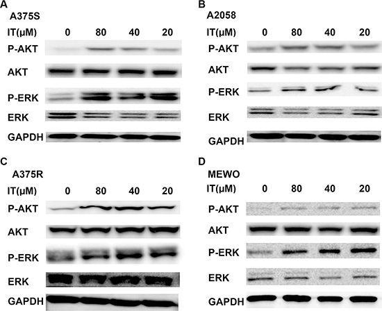 Figure 6: IT activated AKT and ERK signaling in melanoma cells. A375S (A), A2058 (B) , A375R (C), and MEWO (D) cells were treated with various concentrations of IT ( 20, 40, and 80 μM) or vehicle control for 24 h, and then cell lysates were extracted for western blot analysis using antibodies specific to p-AKT (ser473), AKT, p-ERK (Thr202/Tyr204), and ERK.