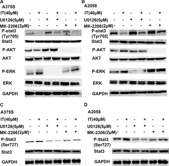 Figure 7: Blockade of AKT and ERK activation partially reversed IT-induced STAT3 inhibition. A375S (A, C) and A2058 (B, D) cells were pretreated with or without MK-2206 (2 μM) or U0126 (5 μM) for 1 h, then the cells were treated with or without IT (40 μM) for another 1 h. The cell lysates were extracted for western blot analysis using antibodies specific to p-AKT (ser473), AKT, p-ERK (Thr202/Tyr204) , ERK, p-STAT3 (tyr 705), p-STAT3 (ser727), and STAT3.