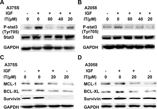 Figure 8: IT inhibited IGF-1- induced STAT3 activation and STAT3 target genes expression. For p-STAT3 analysis, A375S (A) and A2058 (B) cells were grown in serum-free medium, and pretreated with IT ( 20, 40, and 80 μM) or vehicle control for 2 h, then the cells were stimulated with IGF-1 (20 ng/mL) for 1 h. The cell lysates were extracted for western blot analysis using antibodies specific to p-STAT3 (tyr705), and STAT3. For STAT3 target genes assay, A375S (C) and A2058 (D) cells were grown in serum-free medium, and pretreated with IT (20 μM) for 2 h, then the cells were stimulated with or without IGF-1 (20 ng/mL) for 24 h. The cell lysates were extracted for western blot analysis using antibodies specific to BCL-XL, MCL-1, and survivin.