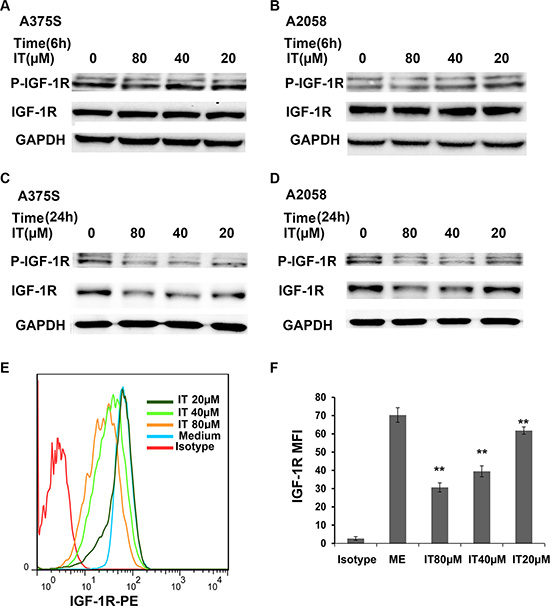 Figure 9: IT reduced the expression levels of phospho-IGF-1R and total IGF-1R in melanoma cells. A375S cells and A2058 cells were treated with IT (20, 40, and 80 μM) or vehicle control for 6 h (A, and B) or 24 h (C, and D). The cell lysates were extracted for western blot analysis using antibodies specific to p-IGF-1R (Tyr1135/1136), and IGF-1R. A375S cells were treated with IT for 72 h, and then the cells were stained with PE conjugated IGF-1R antibody or PE conjugated isotype control antibody. The mean fluorescence intensity (MFI) data was analyzed by FlowJo software V6.0 (Tree star, Ashland, OR). (E) Representative images of IGF-1R MFI. (F) Statistical data of IGF-1R MFI. The MFI data were replicated three times. **indicates P < 0.01, as compared with isotype control group.