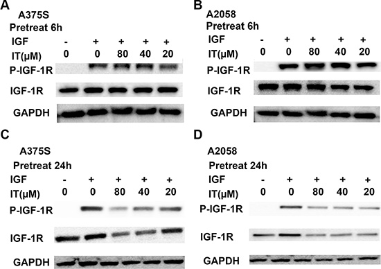 Figure 10: IT inhibited IGF-1-induced activation of IGF-1R most likely through decreases of total IGF-1R. A375S and A2058 cells were grown in serum-free medium, and pretreated with IT (20, 40, and 80 μM) or vehicle control for 6 h (A, and B) or 24 h (C, and D), and then stimulated with IGF-1 (20 ng/mL) for 15 min. The cell lysates were extracted for western blot analysis using antibodies specific to p-IGF-1R, and IGF-1R.