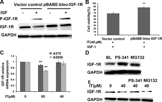Figure 11: Overexpression of IGF-1R partially reversed IT-induced cell growth inhibition. A375S cells were transiently transfected with pBABE-bleo IGF-1R or pcDNA for 48 h. (A) the transfected cells were stimulated with or without IGF-1(100 ng/mL) for 15 min. The cell lysates were extracted for western blot analysis using antibodies specific to p-IGF-1R, and IGF-1R. (B) The transfected cells were treated with IT(40 μM) and stimulated with IGF-1 (100 ng/mL) for 24 h, and then cell viability was determined by MTT assay. **indicates P < 0.01, as compared with vector control. (C) IT slightly inhibited IGF-1R transcription. A375s and A2058 cells were treated with IT (40, 80 μM) or vehicle control for 24 h. The total RNA was extracted, and then real-time PCR analysis was performed to detect the expression of IGF-1R mRNA. **indicates P < 0.01, as compared with vehicle control. (D) Proteasome inhibitors blockaded IGF-1R degradation. A375S cells were treated with PS-34 1 (20 nM) or MG132 (10 μM) alone for 6 h. The cell lysates were extracted for western blot analysis using antibody specific to IGF-1R. (E) Proteosomal degradation pathway was involved in IT-induced loss of IGF-1R. A375S cells were pretreated with IT (40 μM) for 16 h, and then PS-341 (20 nM) or MG132 (10 μM) was added for another 6 h.The cell lysates were extracted for western blot analysis using antibody specific to IGF-1R.