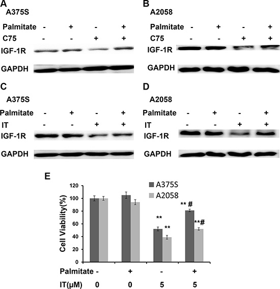 Palmitate partially rescued IT-induced IGF-1R decreases and growth inhibition in melanoma cells