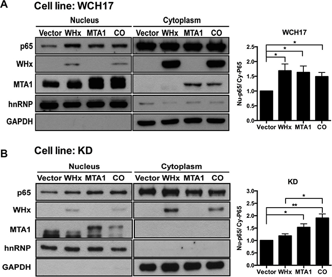 Figure 5: Wk-MTA1 plays an essential role in WHx-induced wk-NF-κB activation. P65 nuclear translocation was assessed in WCH17 (A) and KD/wk-MTA1 WCH17 (designated as KD) (B) cells. The expression levels of wk-p65, WHx, and wk-MTA1 were determined using Western blotting. The relative ratio between nuclear (Nu) and cytoplasmic (Cy) wk-p65 was calculated using a densitometric analysis of the corresponding bands in Western blotting. Moreover, GAPDH and hnRNP served as markers for cytoplasmic and nuclear loading controls, respectively. CO: cells cotransfected with WHx and wk-MTA1-expressing plasmids (*P < .05; **P < .01).
